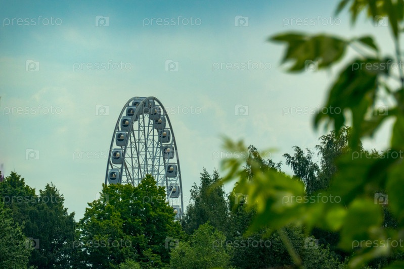 Пейзаж парка развлечений с верхушкой колеса обозрения, показывающей над верхушками деревьев на фоне голубого неба