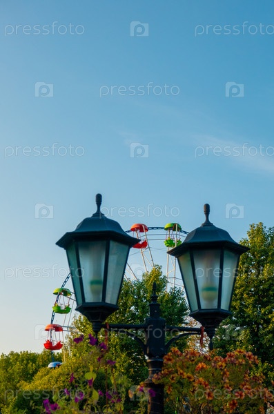 Пейзаж парка развлечений с фонарем, украшенным цветами на фоне верхней части колеса обозрения, показывающего над верхушками деревьев на фоне голубого неба