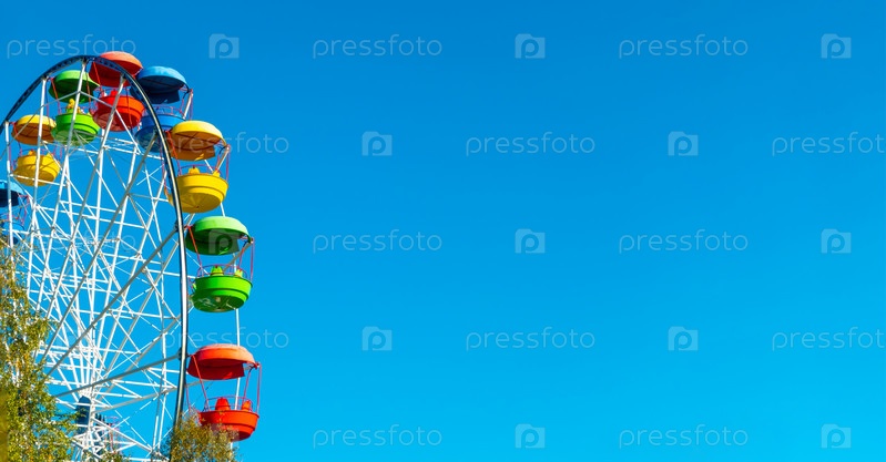 Пейзаж парка развлечений с верхушкой колеса обозрения, показывающей над верхушками деревьев на фоне голубого неба