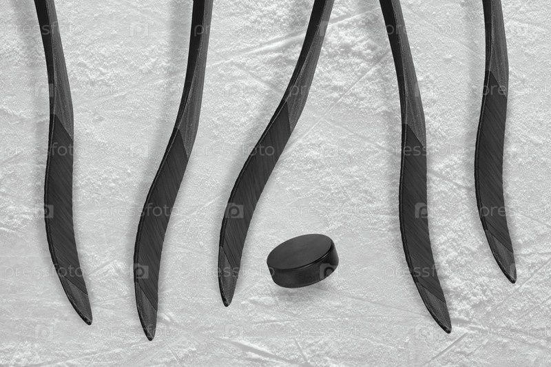 Хоккейная шайба и пять клюшек