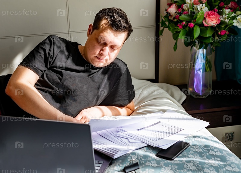 Бизнесмен работает на портативном компьютере, сидит дома и работает с документами. Концепция домашнего офиса фрилансера