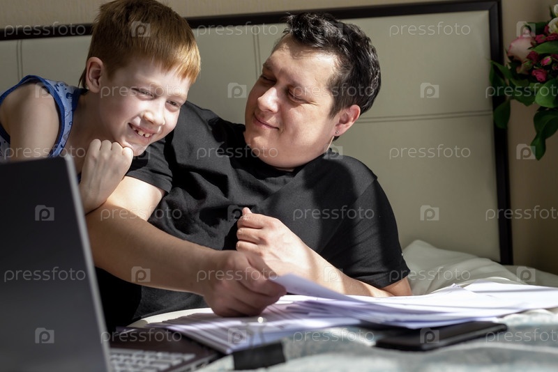 Бизнесмен работает на ноутбуке, сидит дома и работает с документами, папа работает дома. Детский сын рядом с отцом. Концепция домашнего офиса фрилансера