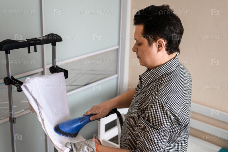 Концепция работы по дому и ведению домашнего хозяйства - молодой отец-мужчина гладит детские штаны-кимоно пароходом, крупным планом