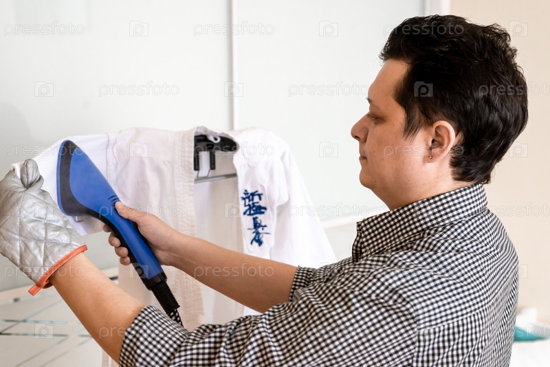 Концепция работы по дому и ведению домашнего хозяйства - молодой отец-мужчина гладит детское кимоно пароходом, крупным планом