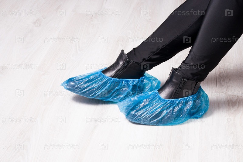 Девушка сидит в черных кожаных сапогах с бахилами, светлый деревянный пол, копия пространства