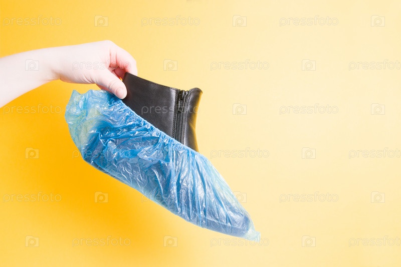 Женская рука держит черный кожаный женский ботинок в бахилах, желтый фон
