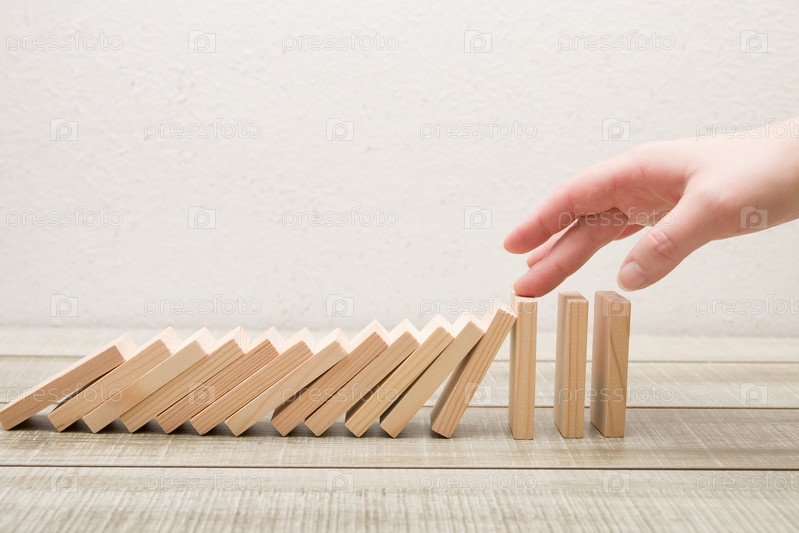 Рука останавливает падение деревянных домино, белое, принцип домино, бизнес-концепция