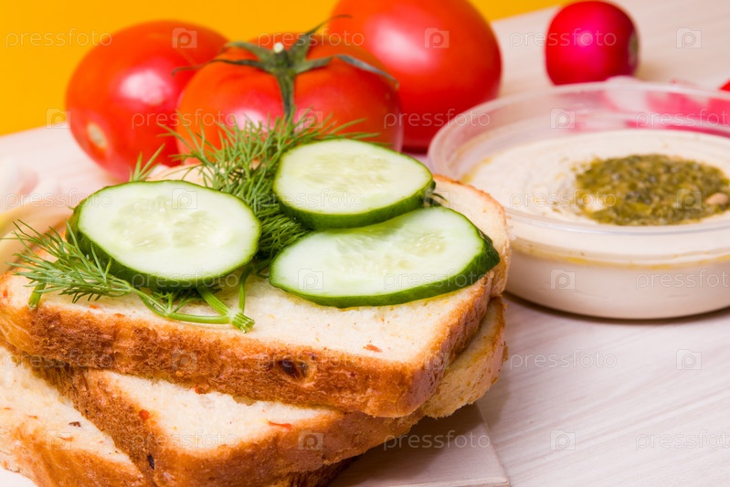 Нарезанный огурец на нарезанном хлебе, овощи и миска с хумусом на заднем плане, веганский сэндвич на завтрак, концепция правильного питания