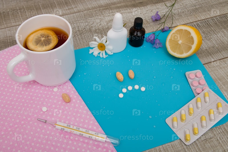 Грустное лицо из таблеток на синем фоне, чай с лимоном, разные таблетки и лекарства от простуды