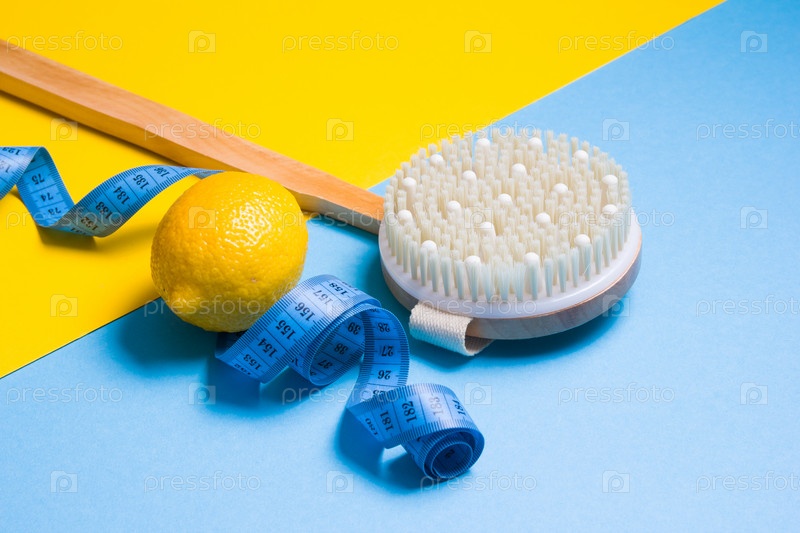 Синяя измерительная лента, деревянная щетка с натуральной кучей кактуса и лимона на желтом и голубом фоне, копия пространства, вид сверху, концепция антицеллюлитного массажа