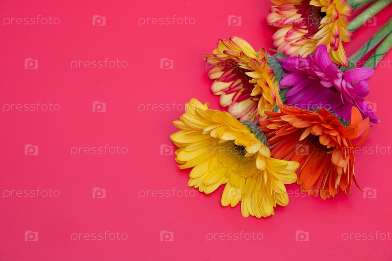 Разные цветные герберы на розовом фоне желтый розовый красный вид сверху пространство для копирования