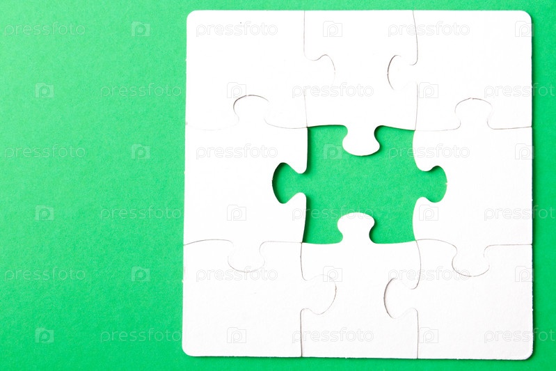 Незаконченная головоломка из белого картона на зеленом фоне и одна неподходящая часть от другой головоломки, одна часть отсутствует, место для копирования, поиск подходящей части