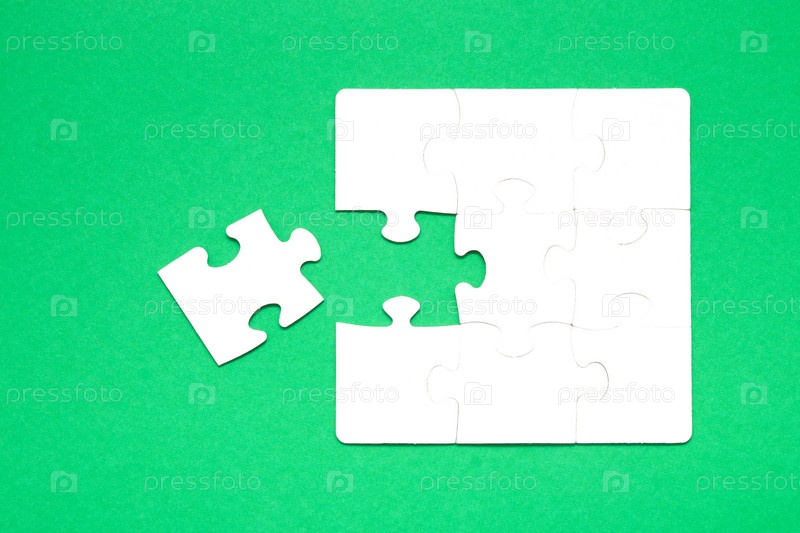 Незаконченная головоломка из белого картона на зеленом фоне и одна неподходящая часть от другой головоломки, одна часть отсутствует, место для копирования, поиск подходящей части