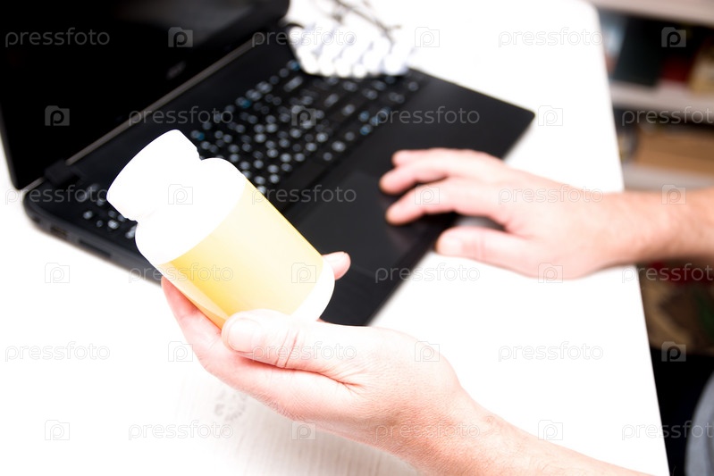 Мужская рука держит банку с лекарством на фоне ноутбука, онлайн-инстинкт, советы по чату