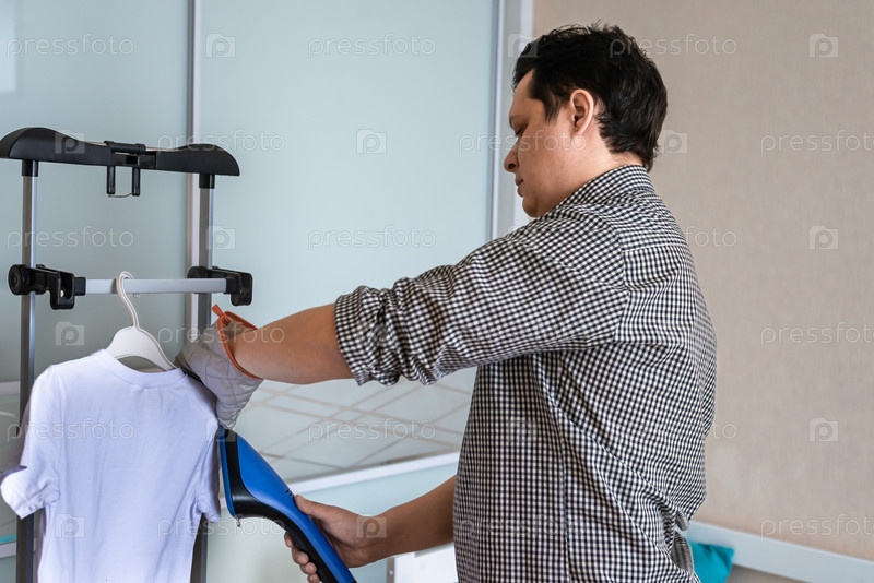 Концепция работы по дому и ведению домашнего хозяйства - молодой отец-мужчина гладит детскую белую футболку пароходом
