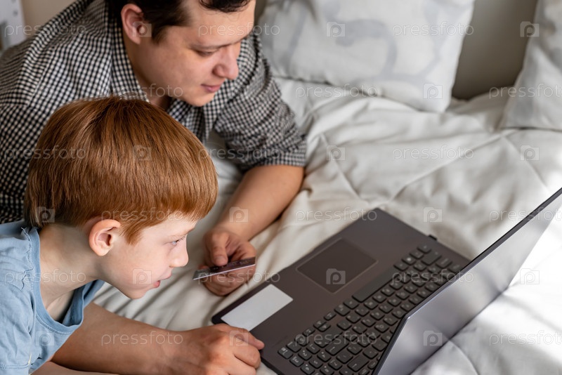 Молодой отец и сын вместе делают покупки в Интернете, проводят время с семьей. Рыжий мальчик и папа за ноутбуком выбирают покупки, вид сверху. Интернет оплата
