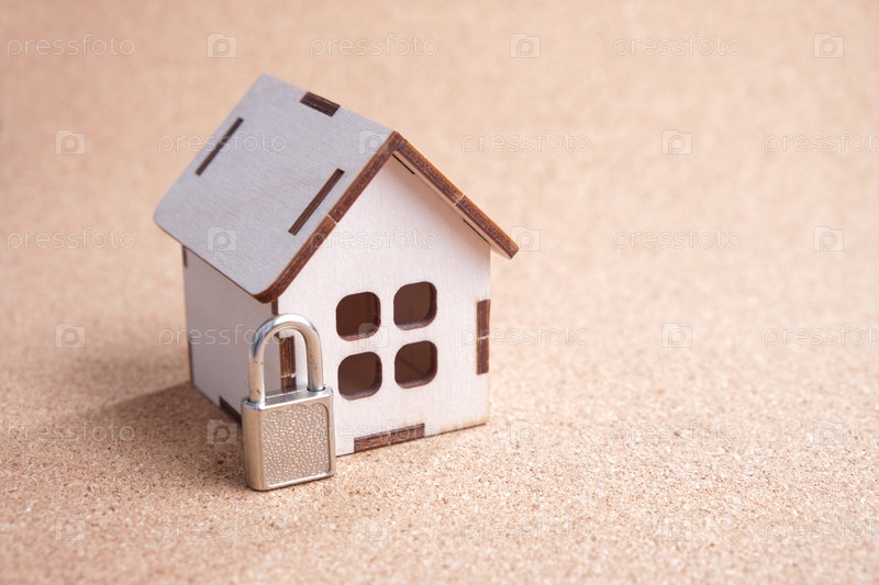 Деревянный игрушечный домик и небольшой замок на пробковой доске, концепция защиты собственности