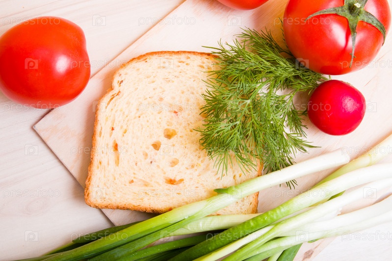 Кусок хлеба, овощи и укроп на деревянном столе, ингредиенты для веганского сэндвича, концепция здорового и вкусного завтрака, вид сверху, место для копирования, макет