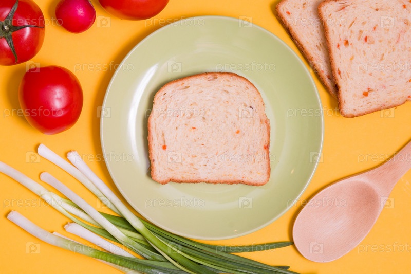 Концепция завтрака, кусок хлеба на зеленой тарелке и овощи на желтом фоне, вид сверху, макет, хлеб, овощи, зеленый лук, помидоры, редис, веганский завтрак