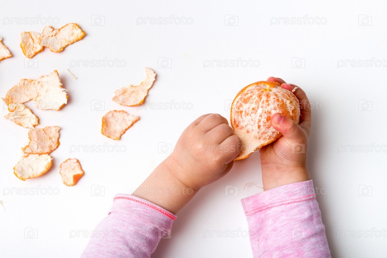 Детские руки кожура мандарина на белом фоне розовый оранжевый