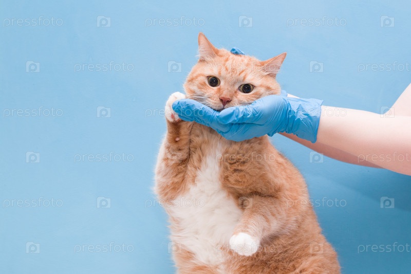Руки в одноразовых синих перчатках бегут за лицом рыжего милого кота, ветеринарная концепция, синий фон, пространство для копирования