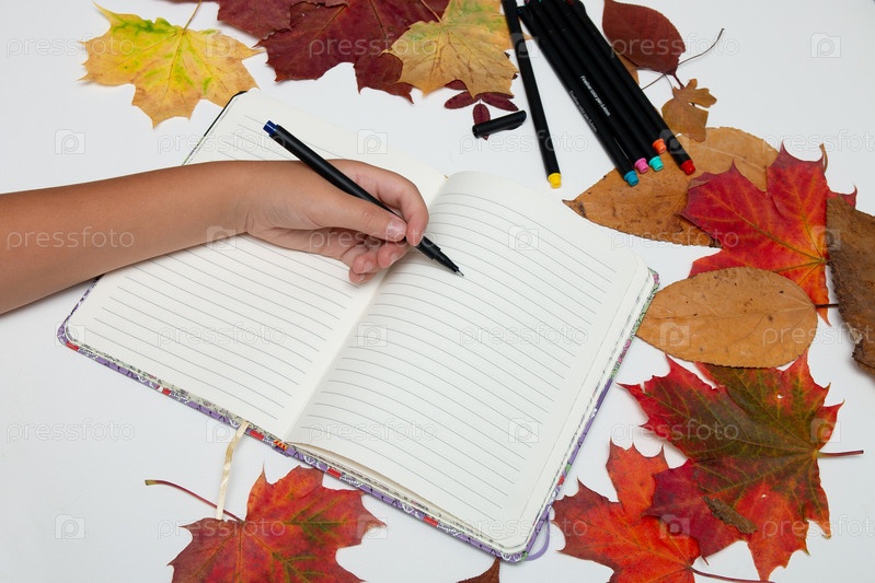 Детская рука с ручкой на блокноте пишет на белом столе, осенние листья, обратно в школу, место для копирования