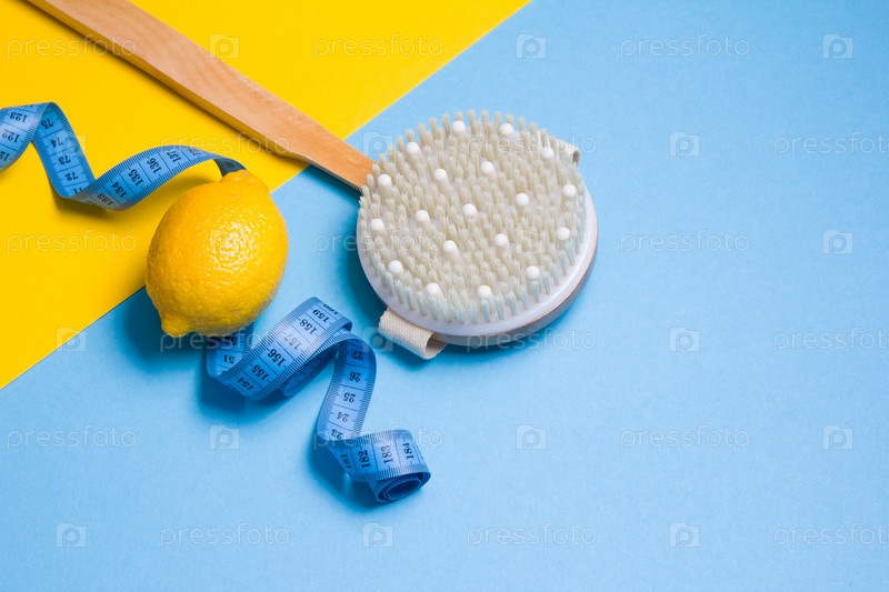 Синяя измерительная лента, деревянная щетка и лимон на желтом и голубом фоне, вид сверху, концепция антицеллюлитного массажа
