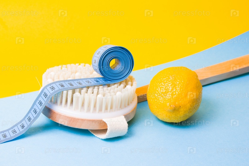 Синяя измерительная лента, деревянная щетка и лимон на желтом и голубом фоне, концепция антицеллюлитного массажа