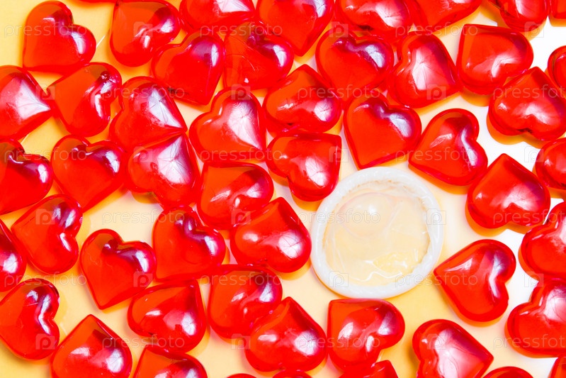 Презерватив и много маленьких стеклянных красных сердечек, желтый фон, концепция защищенного секса
