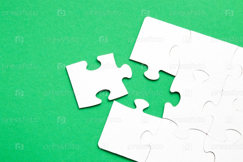 Незаконченная головоломка из белого картона на зеленом фоне и одна неподходящая часть от другой головоломки, одна часть отсутствует, поиск подходящей части