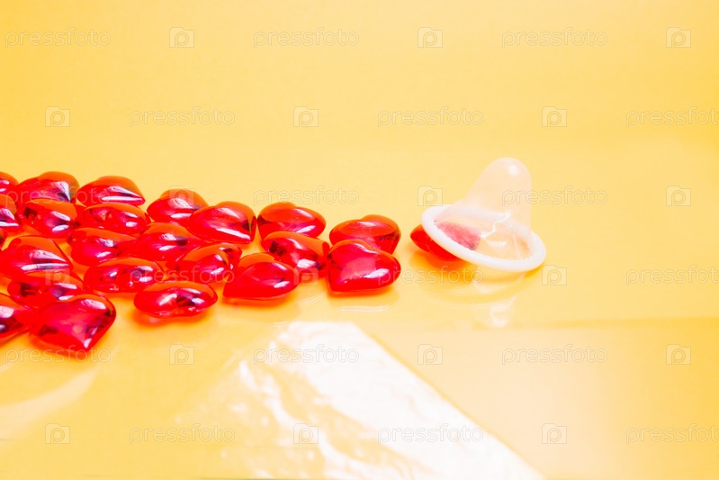 Презерватив и много маленьких стеклянных красных сердечек желтый фон, концепция безопасного секса