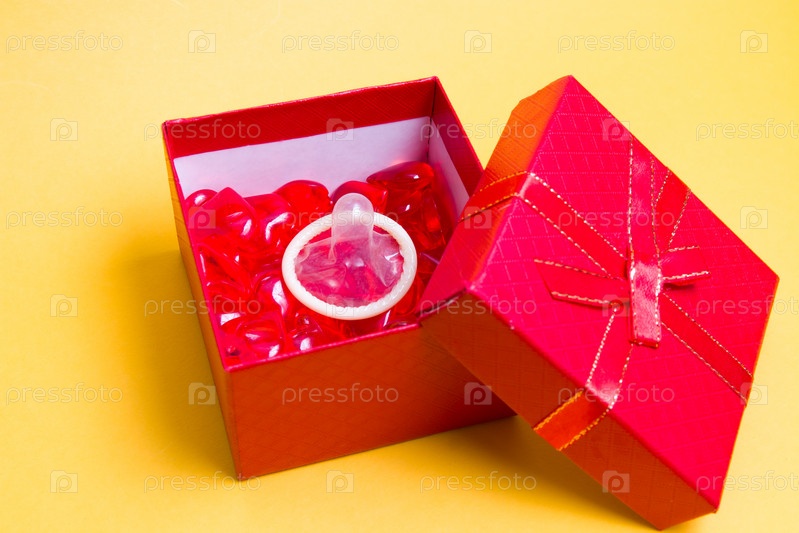 Презерватив и много маленьких стеклянных красных сердечек в подарочной красной коробке, желтый фон, концепция безопасного секса