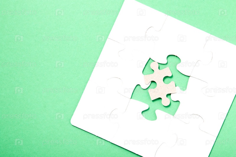 Белые пазлы на розовом фоне, сложенный пазл, отсутствует одна часть, вместо нее часть другой головоломки, неподходящая часть, в отличие от других, копировать пространство