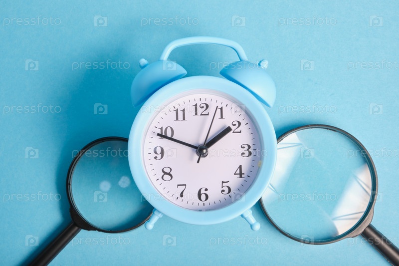 Лупы и голубой будильник на синем фоне