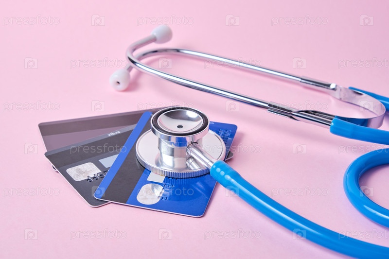 Стетоскоп и кредитные карты на розовом фоне, концепция влияния кризиса на обменный курс и доходы населения, кризис из-за коронавируса