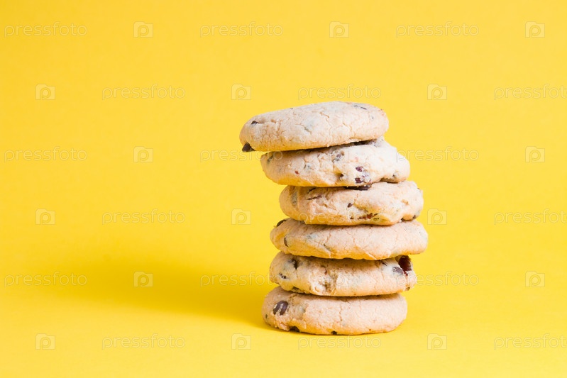 Печенье на желтом фоне, чипсы с кусочками шоколада и брусникой? копировать пространство