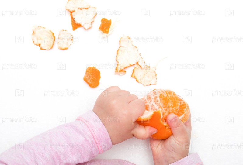 Детские руки кожура мандарина на белом фоне розово-оранжевая девочка
