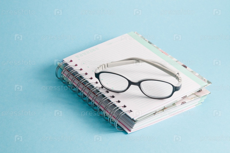 Детские очки лежат на блокноте, синий фон, пространство для копирования, серая изогнутая антивандальная оправа для очков