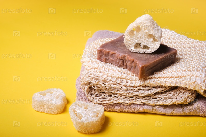 Натуральные аксессуары для ванной комнаты, домашнее мыло, мочалка, вязаные мочалки на желтом фоне, концепция образа жизни без отходов, скажи нет пластику, экологически чистый набор для ванной комнаты