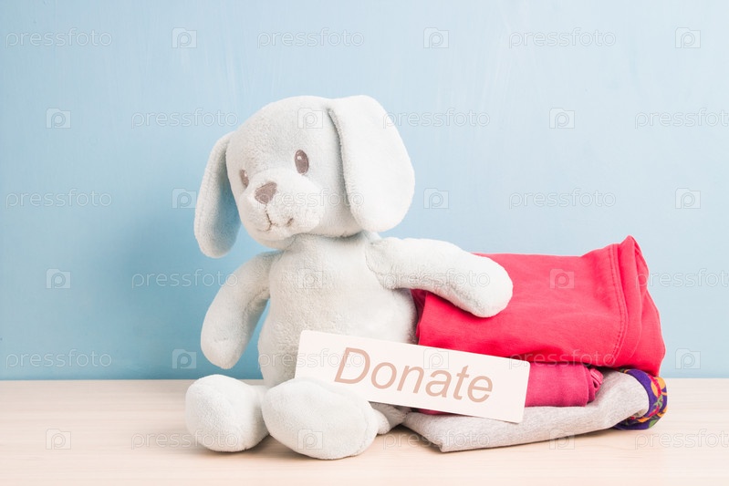 Светло-голубой плюшевый щенок и куча детской одежды для пожертвования, синий фон, место для копирования, надпись Jonate на картоне