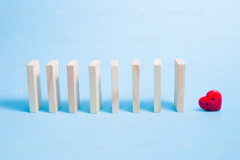 Домино стоят в ряд и красное сердце на голубом фоне, принцип домино, пространство для копирования, концепция разбитого сердца, угроза сердцу, здравоохранение