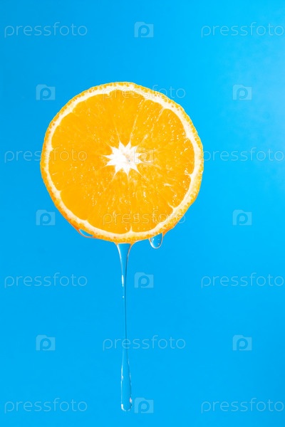 Капля прозрачного геля стекает с летящей дольки апельсина, синий фон, микростиль, левитация мандарина