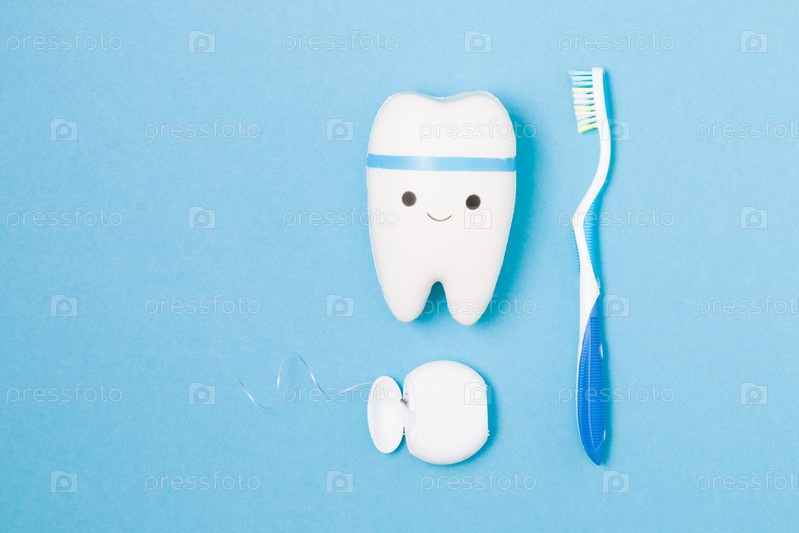 Зубная щетка, зубная нить и игрушечный зуб на синем фоне, модель зуба с улыбкой, концепция защиты полости рта от кариеса, реклама детской стоматологии