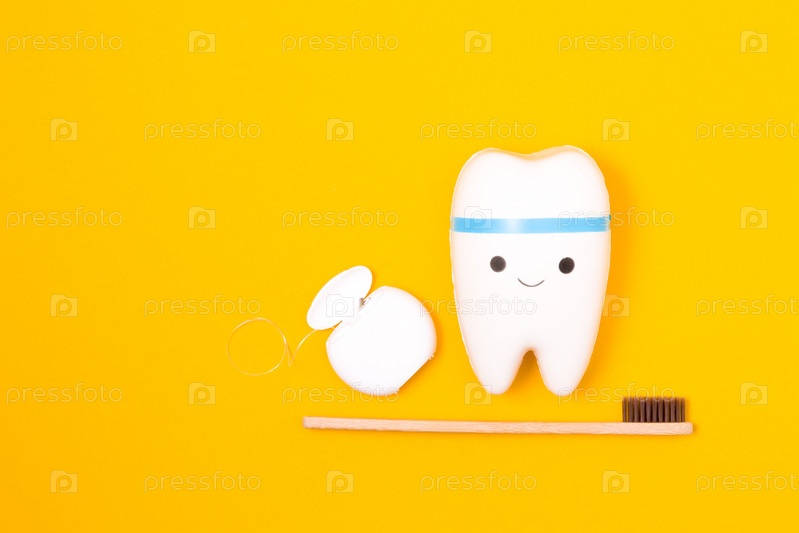 Модель зуба, зубная нить и бамбуковая зубная щетка на желтом фоне, счастливый зуб, белый здоровый зуб, пространство для копирования, концепция ухода за полостью рта