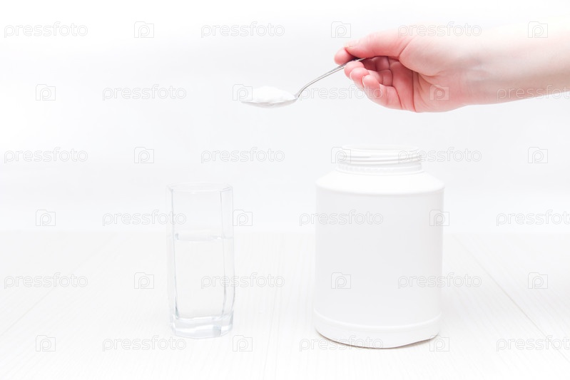 Банка и стакан воды на белом фоне, рука держит ложку и насыпает порошок в стакан воды, концепция абсорбирующей обработки