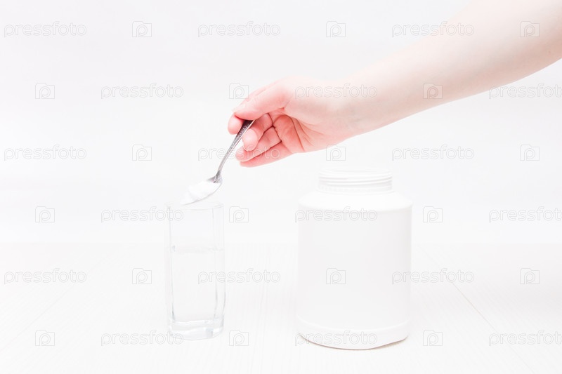 Банка и стакан воды на белом фоне, рука держит ложку и насыпает порошок в стакан воды, концепция абсорбирующей обработки
