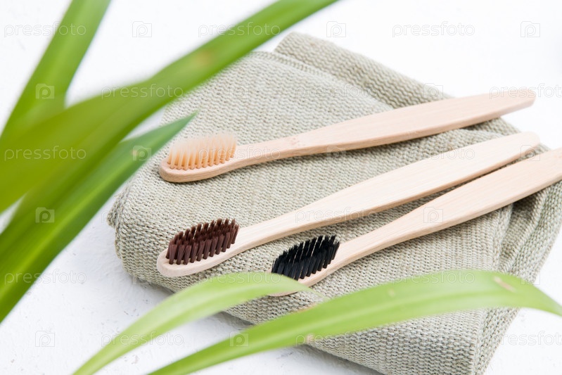 Три бамбуковые зубные щетки на грубой зеленой натуральной ткани, пространство для копирования на белом фоне, вид сверху, листья зеленого растения на переднем плане размыты