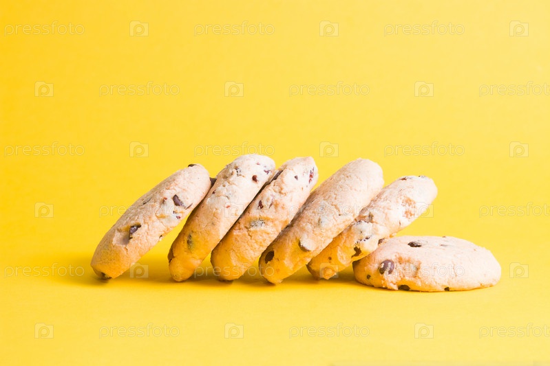 Печенье на желтом фоне, печенье с кусочками шоколада и брусникой