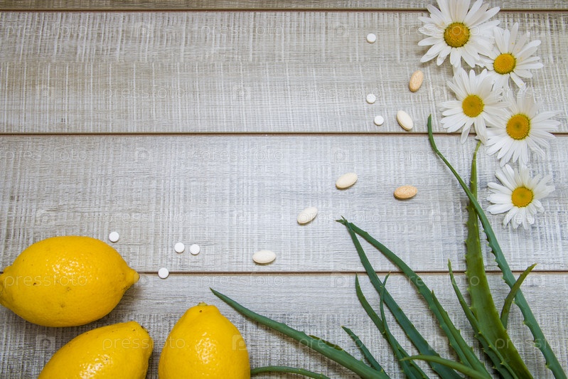Лимоны, ромашки, листья алоэ и различные таблетки на деревянном сером фоне, вид сверху, место для копирования, горячая распродажа