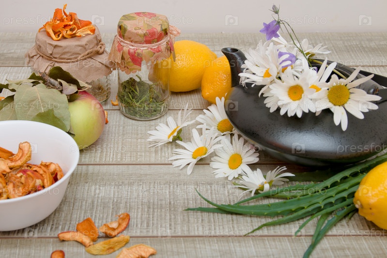 Различные таблетки, черный чайник с ромашками и разные банки чая на сером деревянном столе, сезонные, натуральные лекарства, лечение простуды